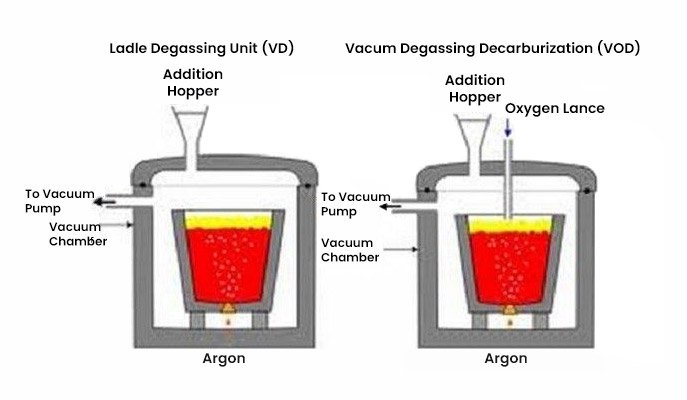 The most critical part in steel melting shop is the refining of liquid steel which is done through a 10 mt and 15 mt capacity vd. The high pressure (0.67 milibar) generating capability of the VD through its 5 number of pumps and continous argon purging removes inherent gases such as nitrogen, oxygen and hydrogen from the steel.